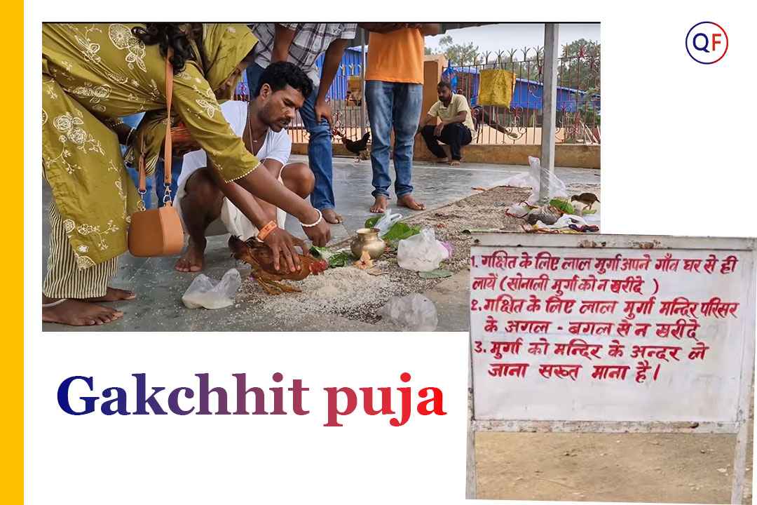 This is a mannat kind of worship, which is in the local language called gakshit. This Puja is performed in a very unique way. First, a devotee brings a red rooster (Lal Rangua Murga) along with puja items and rice grains in a plate to the Goddess’s courtyard. The Pahan recites mantras and invokes the deity while guiding the devotee’s wish.