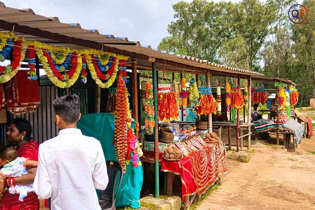 We bought a Normal Puja Thali for ₹100, which included coconut, chunri (sacred cloth), lachi dana (puffed sweets), sindoor, incense sticks, etc.