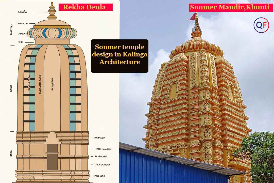 The Sonmer Temple is designed in the style of Kalinga architecture, which is a form of the Nagara style of North India, primarily seen in Jagannath Temple, Odisha.